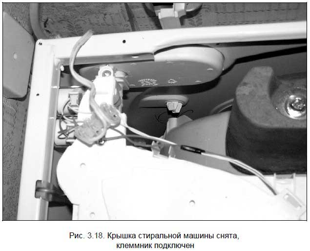 Недалеко от места подвода входного шланга рядом стоят два (как в рассматриваемой СМ) ранее упомянутых электромагнитных клапана (см. рис. 3.17). К ним через разъемы подведены провода. Когда СМ требует залить воду, на эти клапаны поступает переменное напряжение 200–220 В. Они открываются и пропускают воду в резервуар и барабан. К электромагнитным клапанам идут четыре провода — по два на каждый). Подключите параллельно контактам клапанов клеммник (рис. 3.18) и, подсоединив пару проводов, выведите их за пределы корпуса СМ.