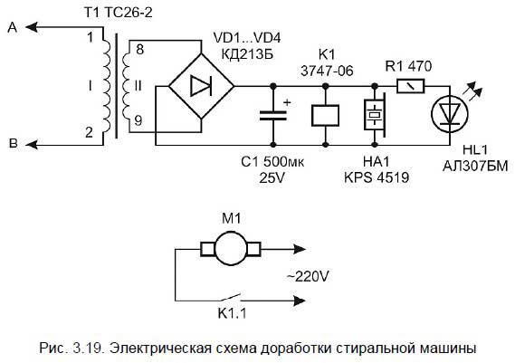 На схеме также показан пьезоэлектрический капсюль со встроенным звуковым генератором НА1, подключенный параллельно реле, и светодиод HL1, включенный последовательно с ограничительным резистором R1. Эти элементы соответственно обеспечивают звуковую и световую индикацию включения насоса (и входных клапанов стиральной машины). Если такая индикация (или ее часть) не нужна, соответствующие элементы попросту из схемы удаляют.