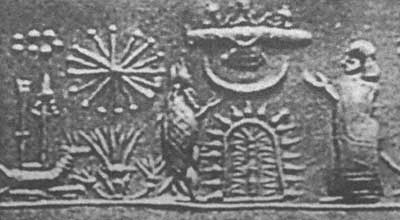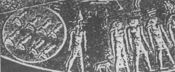 Рис. 38. Оттиск месопотамской цилиндрической печати, возможно изображающий встречу с лунными существами.