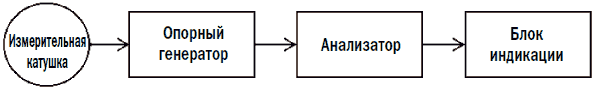 Измерительная катушка является составной частью колебательного контура, резонансная частота которого незначительно отличается от частоты опорного генератора. При появлении металлического предмета в зоне электромагнитного поля, возбуждаемого измерительной катушкой, резонансная частота этого контура изменяется. В зависимости от того, какой металл оказался в зоне действия данного устройства (цветной или черный), частота контура или увеличивается, или уменьшается. При этом происходят соответствующие изменения амплитуды колебаний опорного генератора, которые оцениваются анализатором. В результате анализатор формирует управляющий сигнал для блока индикации.