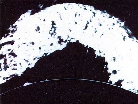 Стационарный протуберанец. Магнитные силовые линии стягивают ярко светящийся мост вещества длиной 800 000 км. По сравнению с ним наша Земля является маленьким шариком.