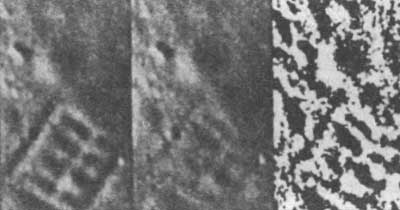 Чтобы обнаруживать такие малозаметные и древние детали поверхности, была создана специальная компьютерная программа SAAM. Она позволяет выявлять на лунных снимках предельно малоконтрастные детали небольших размеров. Для примера на рис. 25 справа показан результат обработки центрального изображения. Теперь прямоугольник постройки заметен вполне отчетливо. Впрочем, четче стали и лунные кратеры.