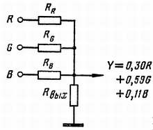 Например, матрица, формирующая сигнал яркости Y, содержит четыре резистора с правильно подобранными их сопротивлениями. Поступающие на три входа этой матрицы сигналы R, G и В, сложившись в нужной пропорции, создадут яркостный сигнал Y = 0,30R + 0,59G + 0,11В.