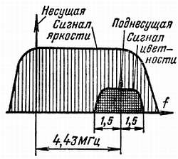 Рис. 210. Спектр частот, занимаемый передающими сигналами яркости и цветности.