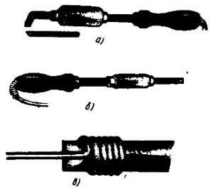Желательно; конечно, иметь два паяльника разных мощностей. Основным же будет электропаяльник мощностью 35–40 Вт. Но такой паяльник нельзя считать универсальным для радиомонтажа. Сравнительно толстым жалом не всегда можно «добраться» до любой точки монтажа. Его жало, кроме того, имеет слишком высокую температуру, опасную для пайки мелких радиодеталей, выводов малогабаритных транзисторов, интегральных микросхем. В таких случаях пользуйся насадкой (рис. 125, в) — спиралью из луженой медной проволоки диаметром 1,5–2 мм, надеваемой на жало паяльника. Пайку мелких деталей осуществляют кончиком насадки, нагреваемой стержнем паяльника.