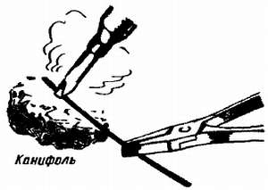 Для радиомонтажа пригодны только такие флюсы, в которых совершенно нет кислоты. Одним из таких флюсов является канифоль. Если пайка производится в легкодоступных местах, используют канифоль в кусочках. В тех же случаях, когда трудно добраться до детали с кусочком канифоли, используют густой раствор канифоли в спирте или ацетоне. Чтобы канифоль хорошо растворилась, ее нужно размельчать в порошок. Так как спирт или ацетон быстро улетучиваются, такой флюс следует хранить в пузырьке и с притертой пробкой, например из-под одеколона. Спирто-канифольный флюс наноси на спаиваемые места при помощи тонкой палочки или кисточки.