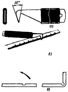 Размечая будущую заготовку, учитывай ширину рабочей части резака. Такой резак понадобится тебе и при гибке листового алюминия или дюралюминия. Дело в том, что получить прямой ровный угол согнутого металла не так-то просто, даже зажимая его в тисках между двумя стальными пластинами или уголками. Иное дело, если этот материал будет предварительно прорезан по линии сгиба примерно на треть или половину его толщины (рис. 129, в). В этом случае угол в месте изгиба обязательно получится ровным и прямым.