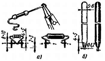 Монтаж на шпильках (рис. 132, а) делают так. Отрезки медной луженой или посеребренной проволоки диаметром 1–1,5 и длиной 8-10 мм запрессовывают в плате так, чтобы с той стороны плазы, где будут детали, они выступали на 4 5 мм, а с другой на 2–3 мм. Чтобы шпильки не болтались, отверстия в плате должны быть чуть меньше диаметра шпилек, а шпильки в средней части чуть сплюснуты ударом молотка. Для запрессовки шпилек используют оправку — стальной стержень с направляющим отверстием под шпильку, просверленным с торца (рис. 132, б). С помощью такого приспособления шпильку можно направить в отверстие и ударом молотка вбить ее.