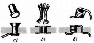 Не только монтажные платы, стойки, планки, но и другие детали придется делать самому, если в твоем пока что небольшом хозяйстве их нет. Например, гнезда и зажимы. Если речь идет о совсем простых конструкциях, которые обычно монтируют на фанерных панелях или шасси, гнезда для них можно сделать из разных имеющихся под руками материалов. Так, например, гнездом может служить гильза стреляного патрона малокалиберной винтовки (рис. 134, а). Гильзу забивай молотком в отверстие с нижней стороны панели, а выступающие сверху края развальцовывай при помощи кернера или другого конусообразного металлического стержня или толстого гвоздя.