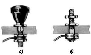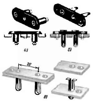 А гнезда, показанные на рис. 135, б, сделаны из листового металла и запрессованы в гетинаксовой планке. При помощи винтов или шурупов, пропущенных через отверстия в планке, их монтируют на панели или шасси.