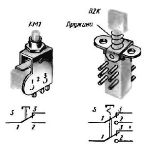Устройство переключателя КМ1 аналогично конструкции тумблера МТ-1, но у него переключение контактор осуществляется нажатием на кнопку. Переключатель П2К двухсекционный, и каждая секция может работать как самостоятельный двухпозиционный переключатель. Выводами контактов секций служат отрезки посеребренной проволоки, впрессованные двумя рядами в пластмассовый корпус. При нажатии на кнопку ее шток подвижными контактами замыкает средние контакты секций с одним из крайних контактов. Шток возвращает в исходное положение спиральная пружина.
