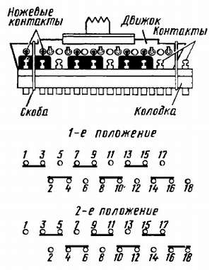 Переключатель состоит из пластмассовой колодки с 18 пружинными контактами, расположенными в два ряда, и движка с шестью ножевыми контактами — по три контакта с каждой стороны движка. При одном (по рис. 141 — крайнем левом) положении движка ножевые контакты замыкают пружинные контакты 1 и 3, 2 и 4, 7 и 9, 8 и 10, 13 и 15, 14 и 16, а при другом (по рис. 141 — крайнем правом) положении — контакты 3 и 5, 4 и 6, 9 и 11, 10 и 12, 15 и 17, 16 и 18. Таким образом, каждые три рядом стоящих контакта (например, контакты 1, 3 и 5) и относящийся к ним ножевой контакт образуют самостоятельный переключатель, которым можно коммутировать две цепи.