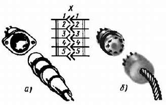 Унифицированный пятикотактный разъем промышленного изготовления показан на рис. 142, а. Он состоит из гнездовой части, укрепляемой на панели или шасси радиотехнического устройства и штепсельной части, вставляемой в гнездовую часть. Чтобы исключить неправильное соединение, в гнездовой части имеется паз, а в штепсельной соответствующий ему выступ. Контакты гнездовой части на схемах изображают, как и гнезда, в виде рогатки, а контакты штепсельной части в виде вилки. Параллельные линии на обеих частях разъема символизируют механические связи между их контактами.