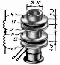 Каркасом служит картонная гильза охотничьего ружья 16-12-го калибра (18–20 мм) или трубка такого же диаметра, склеенная из плотной бумаги. Сама же катушка состоит из двух секций: L2 — основной и L1 — подстроечной. Бортики секции L2 — картонные кружки, надетые на каркас и приклеенные к нему. Наружный диаметр кружков 32–35 мм, внутренний — по диаметру каркаса, расстояние между ними 4–5 мм.