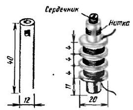 Аналогичный самодельный каркас, который может быть использован для катушек различного назначения, показан на рис. 146, б. Для изготовления его нужны два кольца из феррита марки 600НН с внешним диаметром 8–9 и внутренним 3–3,5 мм и стержневой подстроечный сердечник той же марки диаметром 2,7 и длиной 15 мм. Основой каркаса служит бумажная гильза длиной 12 мм и диаметром, равным внутреннему диаметру колец. Кольца приклей клеем БФ-2 к гильзе на расстоянии 6 мм. Выступающий снизу конец гильзы будешь вставлять в отверстие в монтажной плате (или шасси) и приклеивать к пей. Подстроечный сердечник удерживается внутри каркаса бумажной или матерчатой прокладкой. Число витков и провод для катушки, намотанной на такой каркас, зависит от ее назначения.