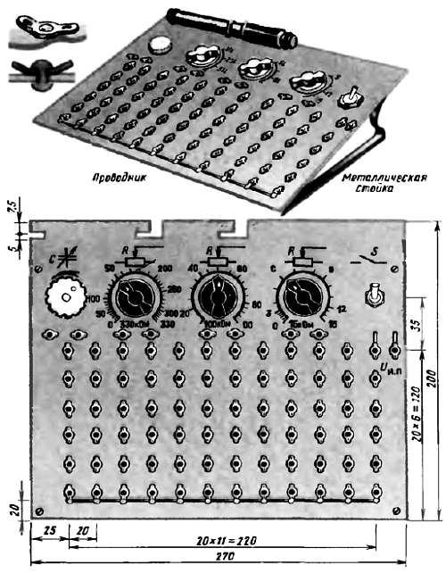 Самое интересное в творчестве радиолюбителя — это, пожалуй, эксперименты, налаживание, поиск наилучшего технического решения конструируемого усилителя, приемника или иного устройства. Пока конструкция простая, макетировать ее можно непосредственно на ее же монтажной плате. Но при усложнении конструкции число деталей, работающих в ней, увеличивается и ее монтажная плата становится уже неподходящей базой для экспериментов. Нужна более удобная панель, на которой можно предварительно смонтировать, подобрать и проверить в работе детали, установить режимы транзисторов, опробовать возможные дополнения и изменения, а затем перенести и смонтировать детали на постоянной плате. Именно так обычно рождаются радиолюбительские конструкции.