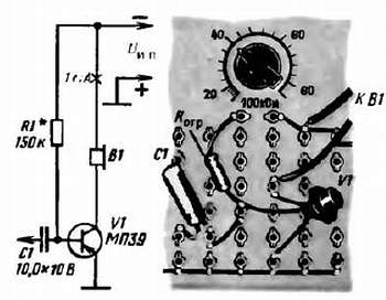 Допустим, что требуется установить коллекторный ток транзистора в пределах 0,8–1 мА. В коллекторную цепь транзистора последовательно с телефонами В1 включаем миллиамперметр, а в цепь базы вместо резистора R1 — два последовательно соединенных резистора: переменный на 100 кОм, имеющийся на плате, и постоянный Roгp сопротивлением 80-100 кОм, ограничивающий ток базы, когда сопротивление переменного резистора будет равно нулю. Вращая ручку переменного резистора, устанавливаем требуемый ток коллектора. В цепь базы должен быть включен резистор, сопротивление которого равно сумме сопротивлений переменного (узнаем по его шкале) и ограничительного резисторов. Если статический коэффициент передачи тока h21Э транзистора большой, а начальный ток покоя коллектора должен быть сравнительно малым, например 0,3–0,5 мА, последовательно с ограничительным резистором придется включать переменный резистор на 330 кОм. И наоборот, если h21Э транзистора небольшой, а коллекторный ток должен быть 6–8 мА, как это бывает, например, в однотактных выходных каскадах, то в цепь базы транзистора надо будет включить переменный резистор на 15 кОм, а сопротивление ограничительного резистора уменьшить до 5–6 кОм.