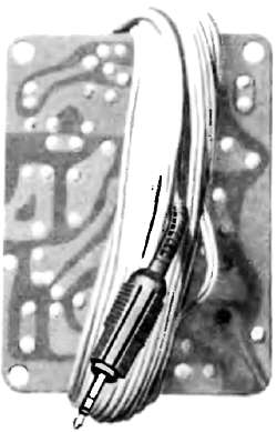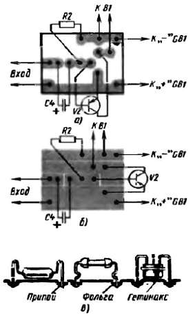 При монтаже выводы деталей пропускают через отверстия в плате и снизу припаивают к печатным проводникам. Для примера на рис. 149, а показаны печатная плата и схема соединения на ней деталей усилителя звуковой частоты к детекторному приемнику, смонтированному по знакомой тебе схеме, приведенной на рис. 92 (справа от штриховой линии). Вид на плату показан со стороны печатных проводников, а детали находятся с другой стороны платы (см. рис. 93). Теперь, если захочешь, ты можешь смонтировать его на печатной плате.