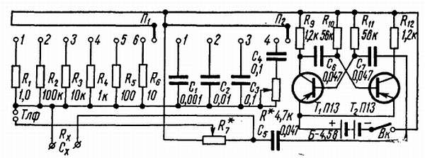 Диапазон измеряемых величин сопротивлений резисторов разбит на шесть поддиапазонов, а диапазон измерения емкостей конденсаторов — на четыре поддиапазона. Для переключения поддиапазонов служат переключатели П1 и П2. Питание моста производится переменным напряжением звуковой частоты, получаемым от мультивибратора, собранного на транзисторах Т1 и Т2 (типа П13 — П15). При налаживании подбором резисторов R10, R11 и R9, R12 добиваются наибольшей амплитуды колебаний генератора. Изменяя емкость конденсаторов С6 и С7, настраивают генератор так, чтобы частота колебаний составила порядка 100 гц. При проведении измерений резистор или конденсатор подключается к клеммам Rx и Сх. Принцип измерения основан на балансировке моста изменением соотношения его плеч. Таким образом, измеряемый элемент (R или С) находится в ветви моста, образованного реохордой моста — потенциометром R7 и одним из резисторов или конденсаторов поддиапазона.