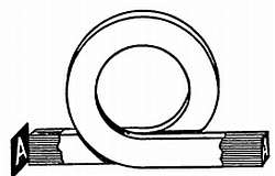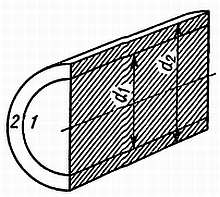Если I0 и I1 — интенсивности соответственно входящего и выходящего из волокна световых потоков, то Т = I1/I0 называют светопропусканием волокна. Оно зависит от ряда факторов: степени прозрачности сердцевины, волокна и оболочки, отражающей способности поверхности раздела сердцевины и оболочки, потерь отраженного света на торцах волокон. Результаты, полученные для светопропускания и других характеристик прямого волокна, оказываются справедливыми и для изогнутого волокна, если его радиус изгиба R удовлетворяет эмпирическому условию R/d1 > 60. Элемент, такого изогнутого световода представлен на рис. 41.
