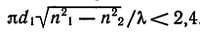 Исследуя распространение света в случае тонких волокон, уже необходимо использовать представления волновой оптики и рассматривать картину распространения по волокну различных мод. Для достаточно тонких волокон (d1 ~= λ) в соответствии с ранее приведенным выражением для N может быть реализован одномодовый режим. Условие осуществления одномодового режима может быть представлено в виде