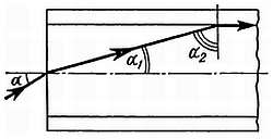 Распространение света в толстом волокне подчиняется законам геометрической оптики. Для простоты будем рассматривать световые лучи, которые распространяются в диаметральных плоскостях, пересекая ось волокна (меридиональные лучи). На рис. 40 изображен один из меридиональных лучей, падающих на границу между сердцевиной и оболочкой волокна под предельным углом полного отражения α2. Угол α, под которым луч падает из внешней среды на торец волокна, носит название максимального угла падения входного луча.