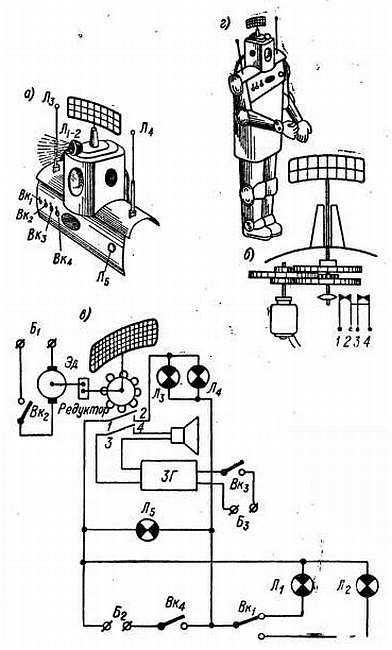 Изменив устройство прерывателя, можно сделать и так, что лампочки на концах антенн будут включаться поочередно. На воротнике монтируются громкоговоритель Гр, подключаемый к выходу генератора, все четыре выключателя типа тумблер. Вк1 нужен для включения лампочек Л1 и Л2, Вк2 служит для включения моторчика Эд и Вк4 лампочек Л3 и Л4; звуковой генератор включается тумблером Bк3, лампочка Л5 — контрольная.