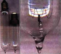 Таким способом удалось получить лампы со световой отдачей 18–20 лм/Вт. Если у обычных ламп колба к концу срока службы заметно темнеет от оседающего на ее стенках вольфрама, то у ламп с йодным циклом она всегда прозрачна. И потому такие лампы оказываются почти вдвое выгоднее обычных. Однако перед глазами у светотехников всегда маячит цифра 425 лм/Вт. Это световая отдача идеальной лампы, которая всю электроэнергию превратила бы в белый свет наилучшего для нашего глаза оттенка. Этот идеал пока не достигнут. Но светотехника идет к нему разными путями.