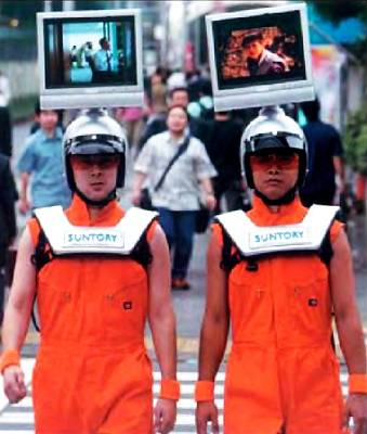 СПЛОШНОЕ ТЕЛЕШОУ. Мы уже рассказывали вам о «телеплащах», которые можно использовать в качестве накидки-невидимки. А вот телешлемы, напротив, предназначены для того, чтобы их обладатели привлекали к себе как можно больше внимания. Эти оригинальные головные уборы предназначены для использования вместо обычных рекламных щитов, которые иногда навешивают на спину и грудь «бутербродам» — специально нанятым служащим. На плоских дисплеях, укрепленных на головах рекламщиков, японские специалисты предлагают демонстрировать такие же телеклипы, как и в обычных телевизорах.