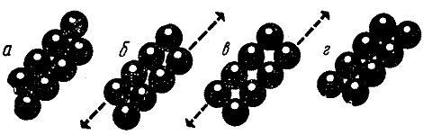 На рис. 27 изображена двумерная модель - два параллельных ряда монет, лежащих на столе. Ясно, что последнее сопротивление сдвигу исчезает в момент, когда атомы- монеты балансируют на вершинах друг у друга; такое положение создается в момент, когда слой оказывается сдвинутым относительно другого слоя на угол 30°. Пройдя эту точку, атомы будут сваливаться в положение равновесия на дне следующей ямы, и сдвиг на одно межатомное расстояние будет завершен. Сопротивление сдвигу началось с нуля, возросло до некоторого максимума, затем снова упало до нуля, когда атомы оказались на вершинах. Сопротивление будет максимальным примерно на полпути к вершине, в нашем случае это соответствует углу сдвига около 15°. Трехмерный случай будет немного более сложным, для него максимум наступает при 10°. Для кристаллов, которые состоят из атомов различных размеров, этот угол может быть еще меньше.