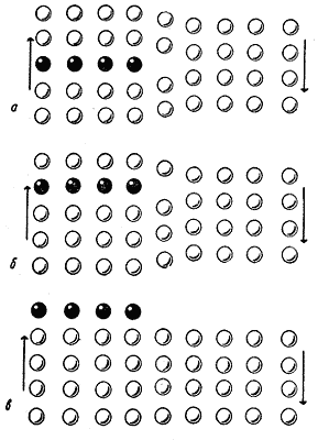 Рис. 28. Схематическое изображение сдвига, происходящего с помощью краевой дислокации. Черные атомы, конечно, не обозначают те же самые атомы в каждой из схем. Они лишь показывают положение "лишней" атомной плоскости. Когда дислокация движется, ни один из атомов не смещается со своего исходного положения более чем на долю ангстрема.