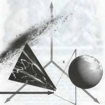 Если же оставаться на уровне наглядных аналогий, то следует вспомнить, что абсолютно пустого пространства не бывает. Вакуум только кажется нам пустотой, на самом же деле это – одно из состояний материи и, как считают физики, самое основное. Мы не ощушаем его, подобно тому как плавающие на десятикилометровой глубине рыбы не чувствуют царящего там чудовишного давления. Образование трехмерных мембран в однородном пространстве-вакууме напоминает выкристаллизовывание прожилок золота в толще горной породы. Электрически заряженные частицы перемешаются вдоль таких же токопроводящих прожилок, оставаясь изолированными от окружающего вещества. Более того, при определенных условиях ток распространяется лишь по поверхности проводника, не попадая внутрь. Теория мембран подсказывает, что мы сами и все окружающие нас материальные тела также движемся по поверхности специфических вакуумных прожилок в девятимерном океане пространства.