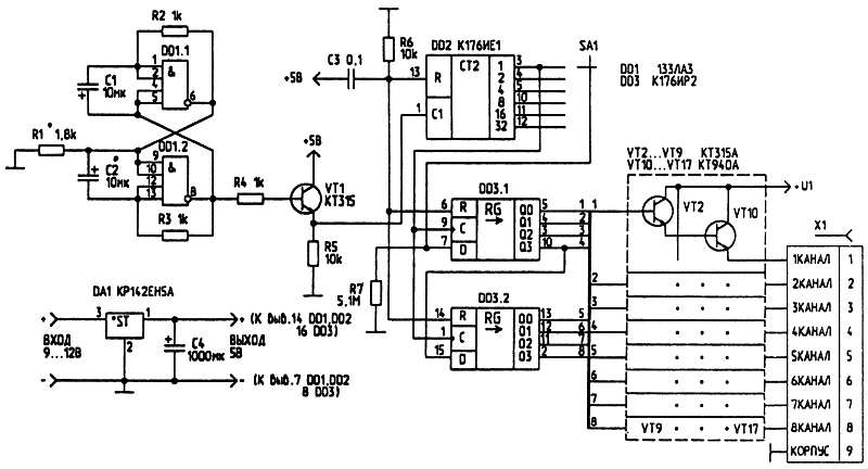 Переключателем SA1 выбирается коэффициент деления тактовой частоты, после которого импульсы подаются на вход регистра DD3.1, а с его выхода Q3 — на вход регистра DD3.2. Благодаря этому — каждый положительный перепад импульсов с выхода 1 счетчика сдвигает высокий уровень на выходах регистров, начиная с выхода Q0 до Q3 DD3.1 и далее с выхода Q0 до Q3 DD3.2. Так образуется зажигание светодиодов по 8 каналам, в каждом из которых используется ключ в виде составного транзистора.