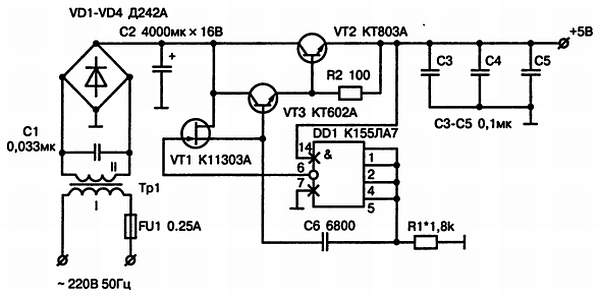 Схема этого сетевого блока питания обеспечивает получение выходного стабилизированного напряжения 5 В при токе нагрузки до 4 А. Принципиальная схема блока приведена на рис. 4.