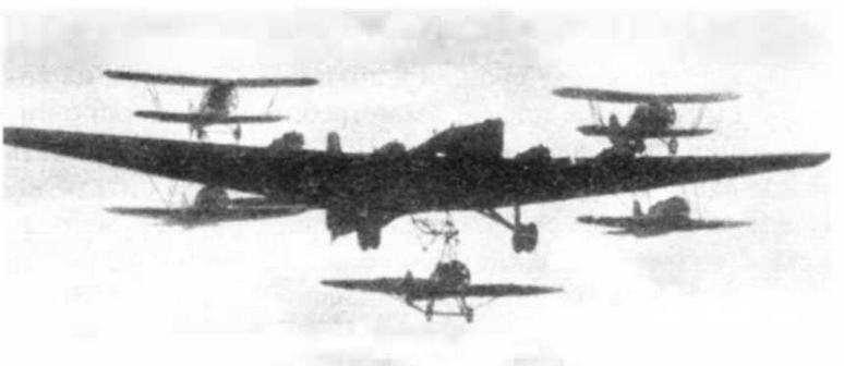 Первым летающим авианосцем стал ТБ-1. На его крыле сверху решили установить два истребителя И-4. Самолет- носитель получил усиленное шасси, на крыле установили стержневые пирамиды с замками. Каждый истребитель крепился в трех точках. Задний замок открывался первым. Интересно, что ТБ-1 сохранял возможность нести бомбовую нагрузку, хотя и значительно уменьшенную.