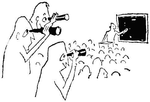Ну а физик? Он сам придумал текст своей «роли», а ведь он далеко не всегда обладает необходимыми для этого способностями, и уж наверняка его этому никто не учил. Не учили его и искусству красноречия, и режиссёр не помогал ему на репетициях. Предмет, о котором он говорит, требует от аудитории заметного умственного напряжения. Для слушателей не создано особых (а часто нет вообще никаких) удобств — стулья неудобные, помещение часто душное и тесное, а программа иногда тянется не один час без перерыва, а порой и то, и другое, и третье. Даже такие звёзды, как Лоуренс Оливье или Эллен Хейс, могли бы спасовать, если бы от них потребовали, чтобы они держали публику в напряжённом внимании в таких условиях. А при столь неблагоприятных обстоятельствах — сможет ли физик тягаться с Лоуренсом Оливье? Легко догадаться, что не сможет, поэтому во время заседания Американского физического общества в коридорах, в буфете или просто на лужайке перед зданием можно насчитать гораздо больше членов общества, чем в зале. А видели ли вы когда-нибудь, чтобы люди, имеющие билет на «Турандот», околачивались вокруг здания Метрополитен-опера вместо того, чтобы сидеть на своём месте, когда поднимается занавес?