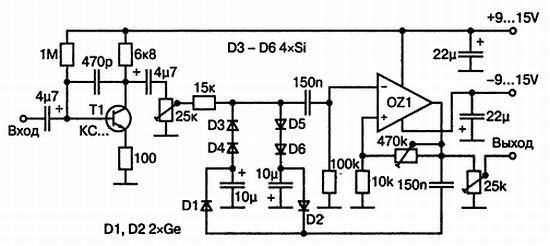 Сигнал, поступающий на вход приставки со звукоснимателя электрогитары, усиливается каскадом, выполненным на транзисторе Т1. Подстроечным потенциометром, имеющим сопротивление 25 КОм, устанавливается базовая чувствительность устройства. Усиленный сигнал далее подается на диодный делитель и каскад усиления, выполненный на операционном усилителе. С выхода операционного усилителя OZ1 усиленный сигнал проходит не только на выход приставки, но и через конденсатор емкостью 150 nF поступает на симметричный выпрямитель, выполненный на германиевых диодах D1 и D2.