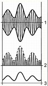 Тут же возникла подсказка в виде диодно-емкостного каскадного выпрямителя, дающего высокое напряжение для анодов кинескопов. У таких умножителей в зависимости от числа каскадов напряжение повышается с каждым новым полупериодом переменного напряжения на входе. Идея умножить напряжение сигнала, не затрачивая энергии батареи питания, показалась заманчивой. Но тут же возникло сомнение — ведь колебания звуковой частоты за детектором должны повторять огибающую амплитудно-модулированного радиосигнала (рис. 1); при многократном умножении в каскадном детекторе происходит некоторое запаздывание амплитудного значения «ступенчатых» полусинусоид.