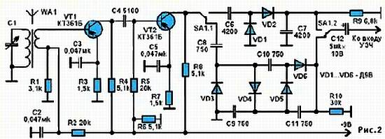Радиочастотный тракт состоял из настраиваемого контура магнитной антенны WA1 и двух каскадов прямого усиления на транзисторах VT1, VT2. Переключатель А1 позволял присоединять к УРЧ обычный детектор, собранный по схеме удвоения (VD1, VD2, С7, R9), и детектор с многократным умножением (VD3…VD6, С9…С11, R10).