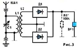Полезно вспомнить старый опыт — двухполупериодное детектирование, дающее параллельное сложение обеих продетектированных полуволн радиосигнала. Сочетая его с каскадными детекторами Д1, Д2 в каждом плече (рис. 3), резонно ожидать вместе удвоение тока и умножение напряжения сигнала.