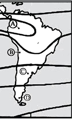 12. В какой из обозначенных на карте Южной Америки точек зима наиболее холодная?
