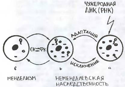 Геном эунариот не является закрытой системой. Носители чужеродных ДНИ и РНК способны проникать в цитоплазму (а), затем происходит либо их исключение из состава генома, либо адаптация (6), когда они стабильно сосуществуют в цитоплазме генома-хозяина, переходя в разряд факультативных элементов. Геном эукариот устроен по принципу «единство целого при свободе частей». Р.В. Хесин впервые пришел к выводу, что благодаря мобильным элементам генофонды всех организмов потенциально объединены в один общий генофонд всего живого мира.