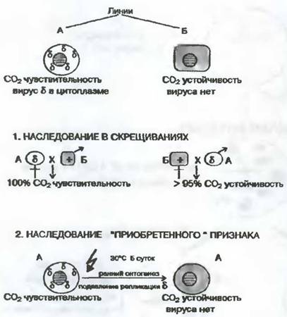 Неменделевское наследование признака, который зависит от популяции факультативных элементов генома. Признак С0г – чувствительности – вызван присутствием в цитоплазме дрозофил вируса «сигма». Наследование цитоплазматическое. После действия температурным шоком на ранних стадиях развития размножение вируса блокируется, и выросшие особи становятся устойчивыми к вирусу («наследование приобретенных признаков»).