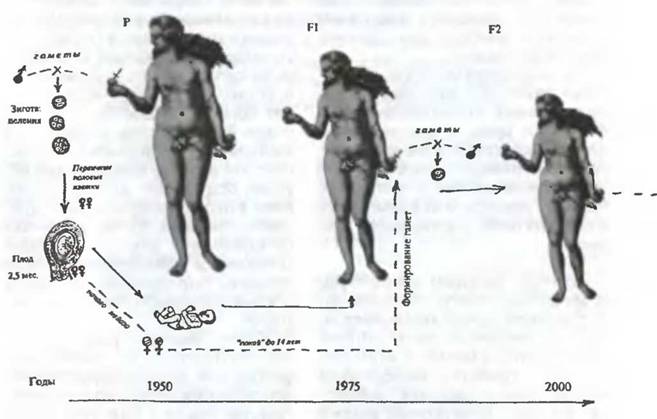 Начало выделения первичных половых клеток у человека восходит к зародышевой стадии материнского поколения. На схеме показаны три последовательных женских поколения половозрелого возраста: поколение Р (или «бабушка»), поколение F1 («мама») и F2 («дочь»). Женская особь поколения-2000 возникла из яйцеклетки, которая начала дифференцироваться еще на эмбриональной стадии развития ее матери, когда ею было беременно бабушка (пятидесятые годы). Таким обрезом, условия, в которых проходила беременность у бабушек, могут влиять но появление и характер выражения наследуемых признаков у внучатого поколения!
