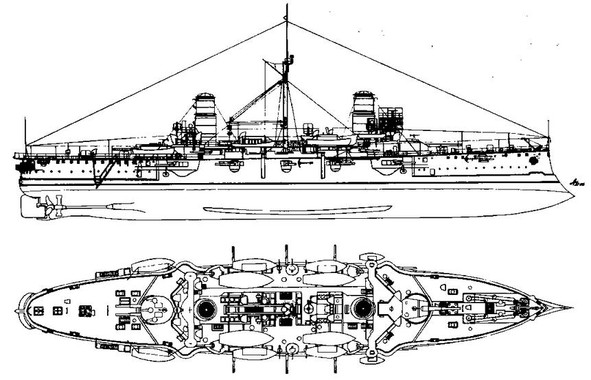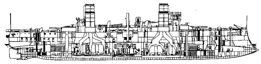 Броненосный крейсер «Ансальдо» (общий вид, верхний вид, продольный разрез, схема бронирования)