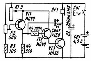 Принципиальная схема ЭМИ приведена на рис. 39. Резистор R1 включен в частотозадающую цепь генератора через каскад на транзисторе VT2 с общей базой. Малое входное и большое выходное сопротивления такого каскада обеспечивают стабильную работу генератора.
