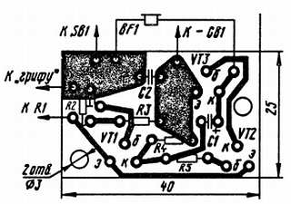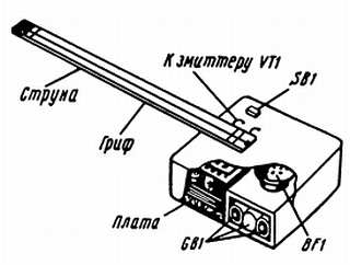 Конструкция ЭМИ показана на рис. 41. Ширина пластины грифа 15–20 мм, длина — около 200 мм. Ее приклеивают к верхней части корпуса, внутри которого размещают плату; телефон BF1 и батарею питания из трех элементов 316 с выключателем. Струну из голой нихромовой проволоки диаметром 0,15-0,2 мм припаивают к концам грифа на высоте 2–3 мм над фольгой. Площадки фольги на концах пластины, к которым припаяна струна, изолируют от остальной части грифа прорезями.