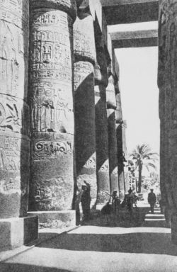 Карнак и Луксор соединялись между собой длинной аллеей сфинксов с бараньими головами, вырубленных из камня. Эту аллею называли тропой богов, ибо в праздники священная барка со статуей Амона шествовала из одного храма в другой. В прошлом веке некоторые памятники были еще покрыты песком, занесенным из пустыни, как будто они лежали под саваном, скрывающим их от солнца. Однако храмовый ансамбль в Карнаке с его воротами, дворами и залами, с бесчисленными колоннами, скульптурами и обелисками, во всем своем великолепии и таинственной роскоши представляет величественнейший памятник Древнего Египта и свидетельствует о древней славе царя всех египетских городов.