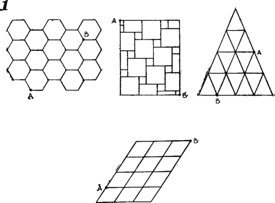 Чтобы проверить, насколько глубоко вы усвоили алгоритмы Сьюзен, попробуйте нарисовать сети улиц, имеющие другие конфигурации, и подсчитать число кратчайших путей, ведущих из точки А в точку В. Четыре задачи этого типа представлены на рис. 1. Решать их можно по-разному, например, воспользоваться комбинаторными формулами, но все методы несколько сложнее алгоритма Сьюзен.