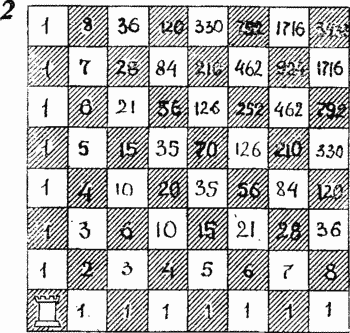 Чему равно число кратчайших путей, по которым ладья может перейти из одного углового поля на шахматной доске в другое, диагонально противоположное? Эта задача легко решается, если каждому полю на шахматной доске приписать по числу так же, как Сьюзен приписывала числа перекресткам на карте города. Ладья ходит только по горизонтали и вертикали. Следовательно, кратчайший путь из любой клетки в любую другую состоит в преодолении разделяющего клетки расстояния по горизонтали и по вертикали. Если числа расставлены верно (см. рис. 2), то они указывают число кратчайших путей, ведущих из нижнего угла в любое поле. Например, поле в правом верхнем углу помечено числом 3432. Следовательно, ладья может перейти с поля, стоящего в левом нижнем углу доски на диагонально противоположное поле 3432 кратчайшими путями.